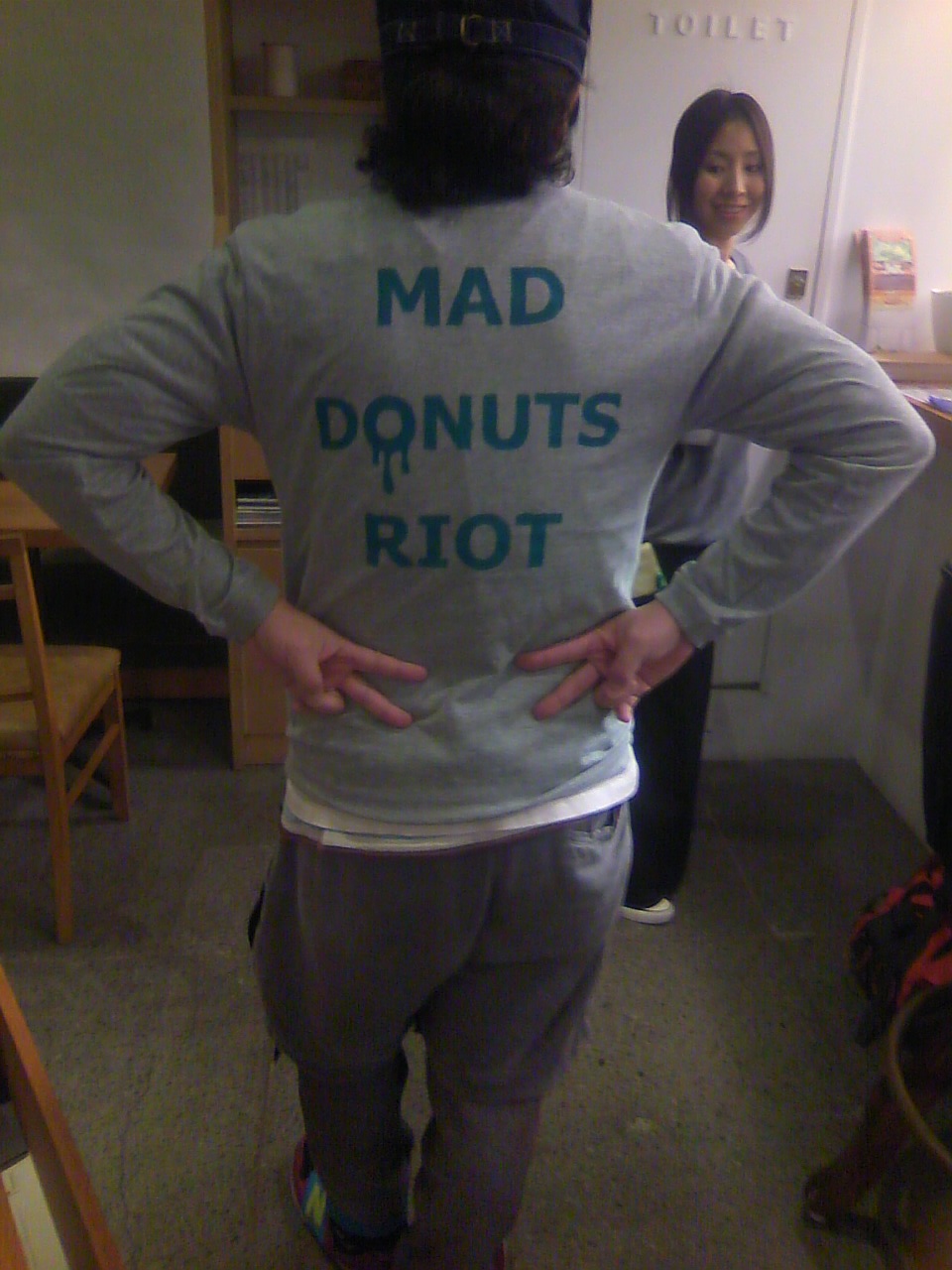 右手の向かいの友人はこの島で得たホテルのエンブレム風の物を、店の棚に並べ